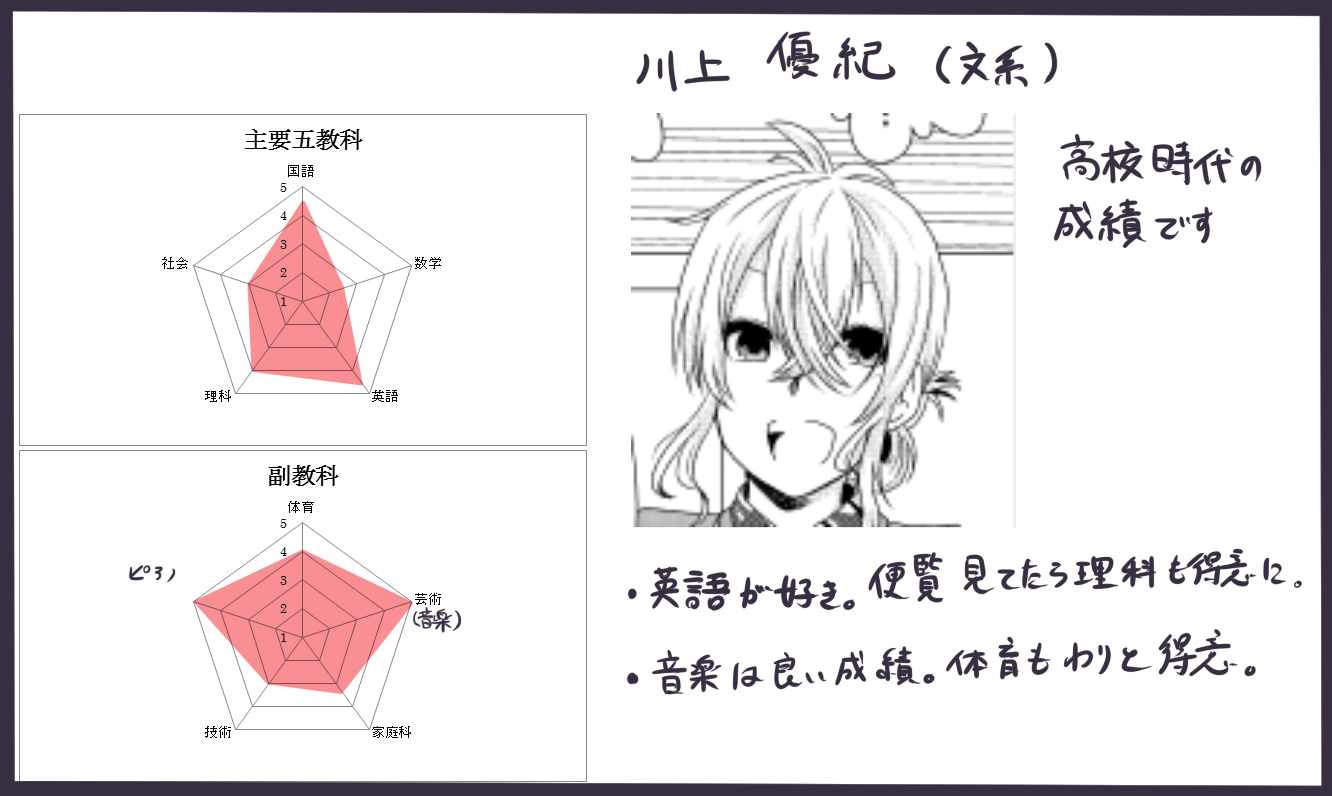 ちょっと社会系は苦手な文系。世界史は音楽に関連する地名などがあって覚えられるため、割と成績は良い。それ以外はあまり得意ではない。